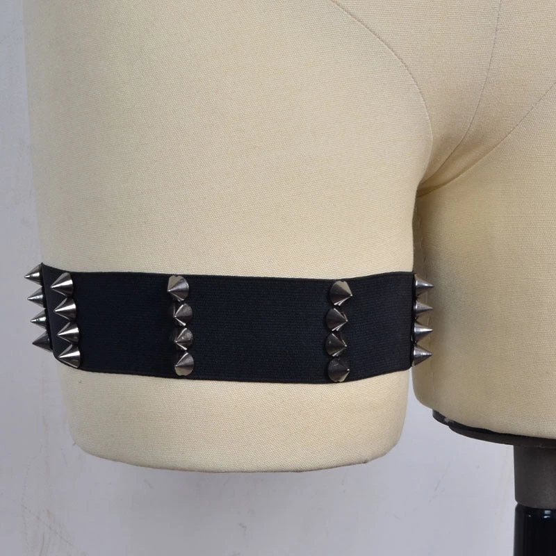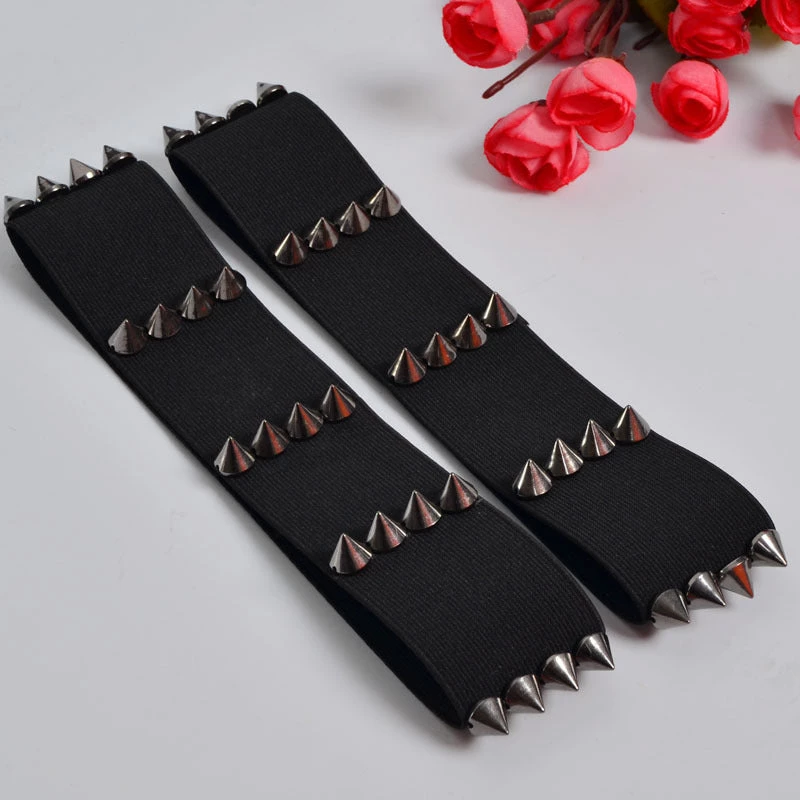 These two black goth-inspired elastic spiked garters are easy to put on and can be worn on top of clothing as well as with a skirt.