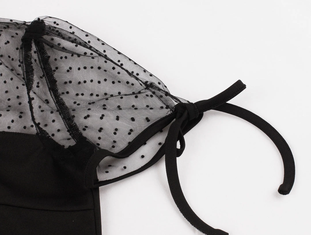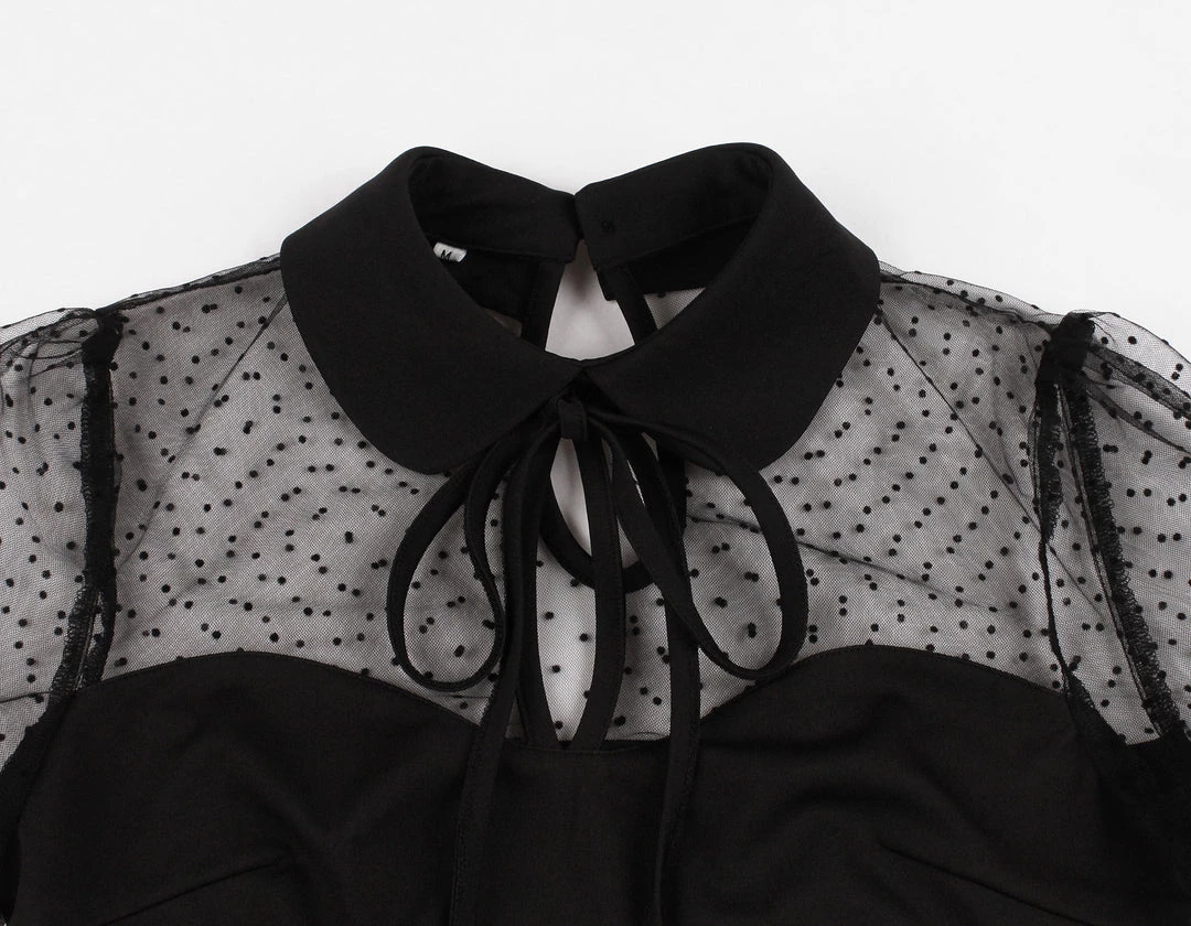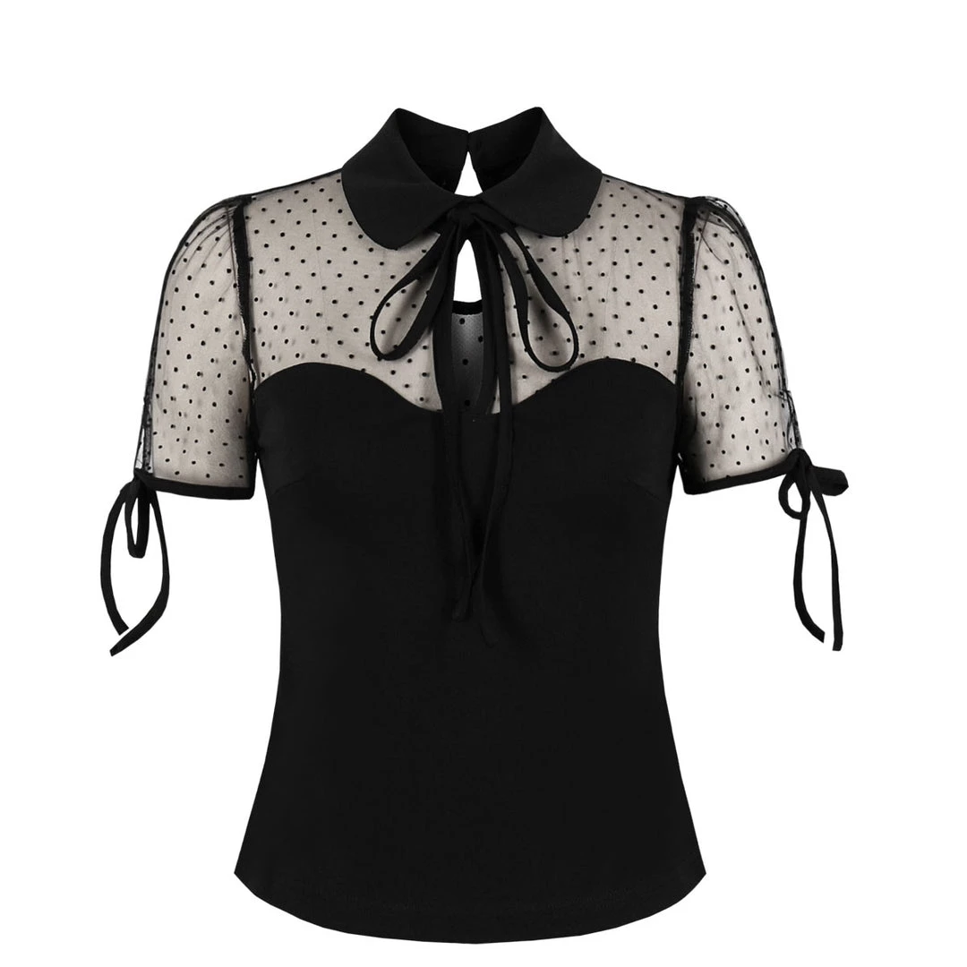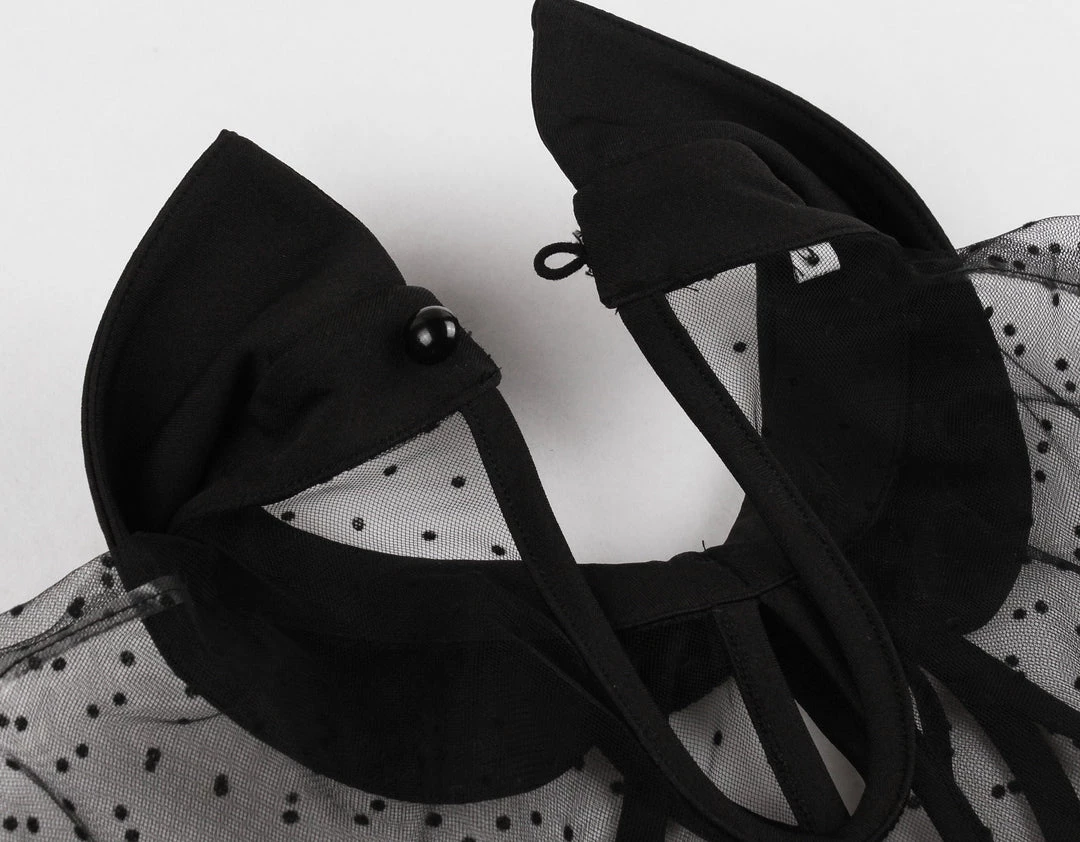 An elegant gothy blouse that goes with any skirt or pants! Well, made except sweatpants but otherwise it’s easy to put together an outfit around it! The lace and the dots give it a cute vintage look that any Morticia fan will dig. The bows on each sleeve and on the neckline provide the perfect graceful look.Â